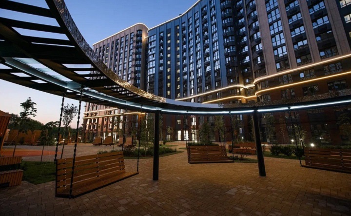 Вместе с первым домом более 300 семей получили уютный двор, свободный от машин, большую детскую площадку, разделённую на зоны для разных возрастов, спортивную площадку, тренажёры и места для спокойного отдыха.