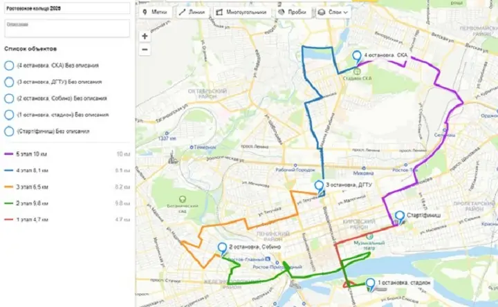 Заключительный, пятый этап забега с 14:10 до 15:00 пройдёт от стадиона СКА по улицам Фурмановской, Раздорской, Казахской, киргизской, 50-летия Ростсельмаша, Троллейбусной, Менжинского, проспектам Шолохова и Театральном, под мостом на проспекте Сельмаш и завершится на Театральной площади.