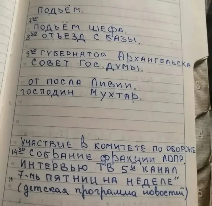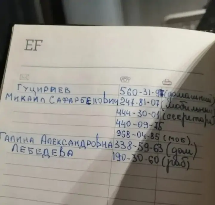 Также в блокноте есть личные телефоны самого Жириновского, Михаила Гуцириева, Владислава Суркова и других известных людей. Впрочем учитывая возраст записной книжки, очевидно что номера явно недействующие.