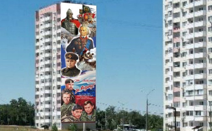 Сам мурал представляет собой полотно, начинающееся (сверху) с изображения Александра Невского, далее идут Александр Суворов и герой Великой Отечественной войны Цезарь Куников. Завершается мурал изображением на фоне цветов российского флага «легендарных командиров донбасского ополчения», героя ДНР Михаила Толстых («Гиви»), героя ДНР и обладателя Ордена Мужества Арсена Павлова («Моторола»), героя ДНР, главы Донецкой Народной Республики Александра Захарченко и участника СВО, Героя Российской Федерации, командира батальона «Спарта» Владимира Жоги.