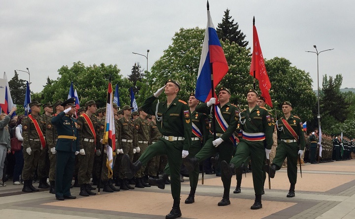 По площади Гагарина военным маршем прошли студенты-курсанты военных учебных вузов Ростовской области. Также волонтёры вынесли знамя Победы длиной 800 кв. метров, сшитое из маленьких частей знамени с именами погибших на фронте бойцов Красной Армии.