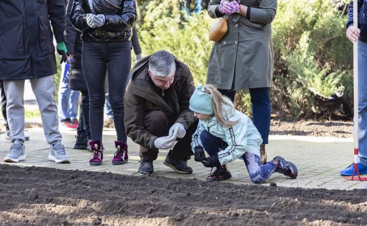 Алексей Логвиненко сажает тюльпаны с ростовчанкой. Фото пресс-службы мэрии