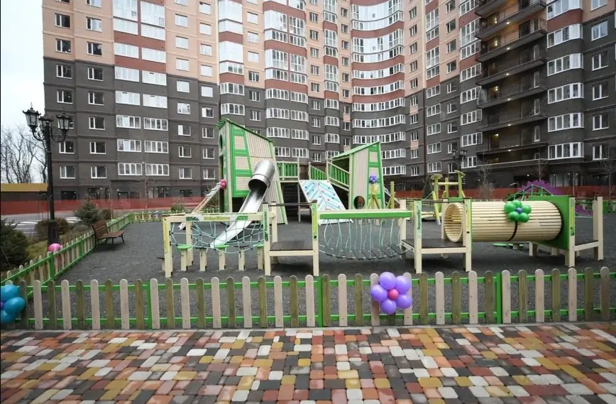 Вместе с новым домом застройщик сдал благоустроенный двор с мини-футбольным полем, светящимися качелями и детскими игровыми комплексами. Отдельного внимания заслуживает визитная карточка экорайона — ей стали несколько арт-объектов на придомовой территории. Новый двор украсила композиция из фонарей в форме цветов, стильные арки над дорожками, а также необычные фигурные скамьи.