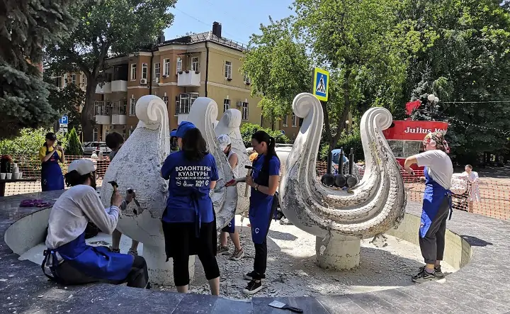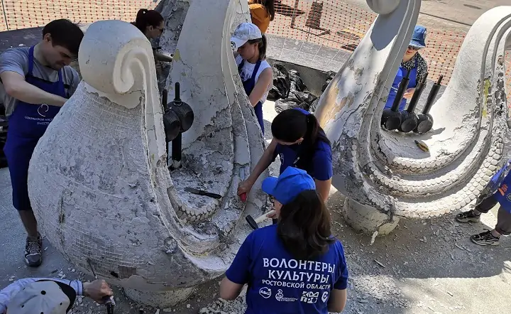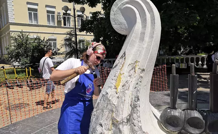 На объекте работают участники движений «Донволонтёр», «Волонтёры культуры», а также неравнодушные ростовчане — проекту нужна любая помощь. Так, в субботу, 11 июня, участие в расчистке фонтана приняла гуляющая по Пушкинской семья — пока дети играли рядом, старшее поколение работало стамесками. В воскресенье, 12 июня, пока кипела работа, подошла ростовчанка с маленьким сыном — они принесли участникам феста стамески. Волонтёры работают под руководством реставратора Марины Яблонской. Она рассказала donnews.ru об этапах работы.