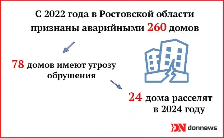 Как рассказал министр строительства, архитектуры и территориального развития Ростовской области Юрий Сильвестров, в октябре 2023 года в регионе была утверждена программа, по которой до 2031 года запланировано расселить фонд, признанный аварийным с 2017 до 2022 года. Всего в списке 525 многоквартирных дома, из них 176 домов грозят обрушением (120 из них находятся в Ростове). На их расселение потребуется 15,2 млрд рублей.