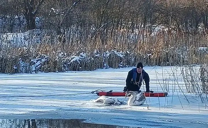 В Ростовской области спасатели эвакуировали замерзающего лебедя на реке Большой Несветай в Родионово-Несветаевской слободе. Самец не мог бросить погибшую подругу и оставался с ней до прибытия помощи, сообщили в «Ростовской областной поисково-спасательной службе».