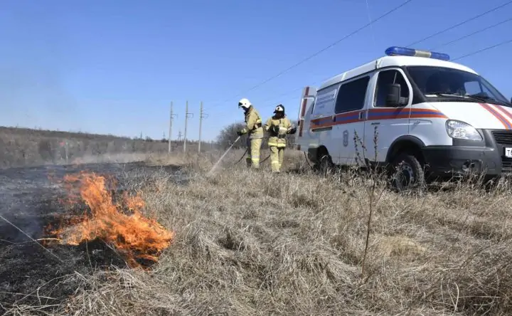 Пожар вспыхнул в северной части села Волошино Миллеровского района, загорелась сухая трава на площади 1,5 тысячи квадратных метров. Огонь подошёл вплотную к жилым домам и перекинулся на тюки с сеном.