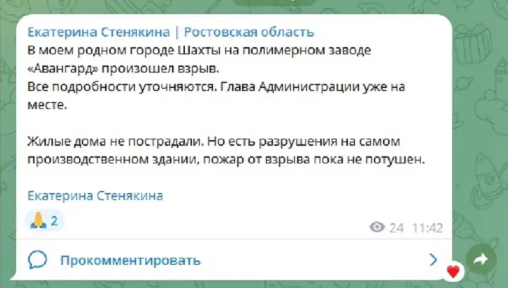 Депутат Госдумы от Ростовской области Екатерина Стенякина в своём Telegram-канале сообщила, что на полимерном заводе «Авангард» произошёл взрыв.