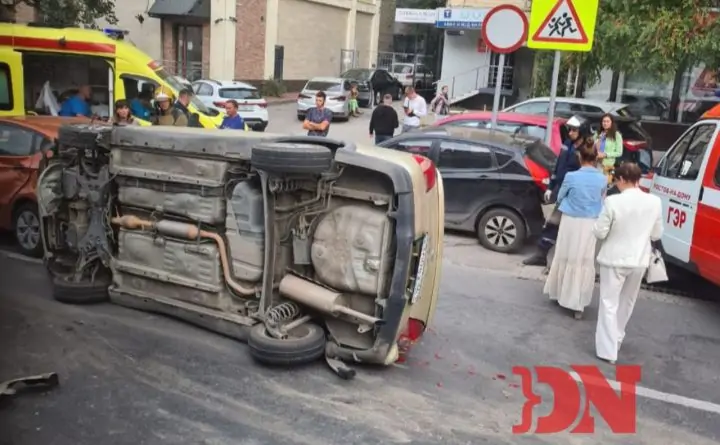В Ростове на пересечении Красноармейской и Ворошиловского столкнулись четыре машины, одна из которых перевернулась. ДТП произошло утром в среду, 13 сентября.