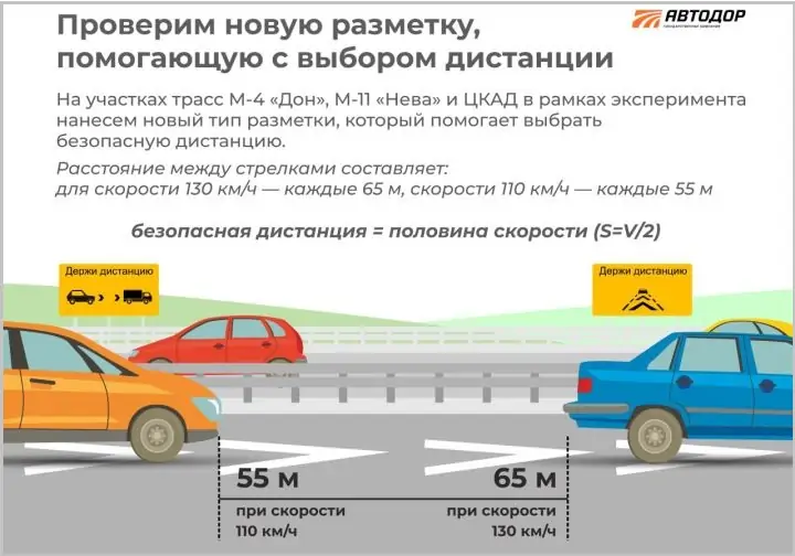 «Она поможет водителям быстрее и точнее ориентироваться на дороге: видя перед собой два шеврона до впереди идущей машины, водитель будет уверен, что держит необходимую дистанцию. Безопасная дистанция на дороге составляет половину от разрешённой скорости. Соответственно, для участков с разрешенной скоростью 110 километров в час это 55 метров», — говорится в сообщении «Автодора».
