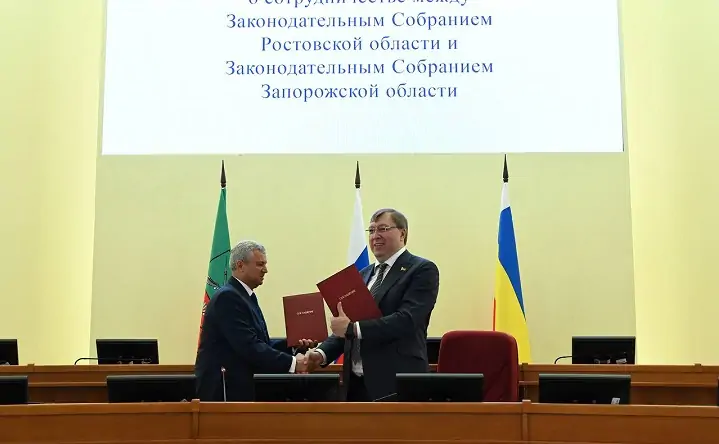 Председатель Законодательного собрания Ростовской области Александр Ищенко и председатель Законодательного собрания Запорожской области Виктор Емельяненко подписали соглашение о сотрудничестве.